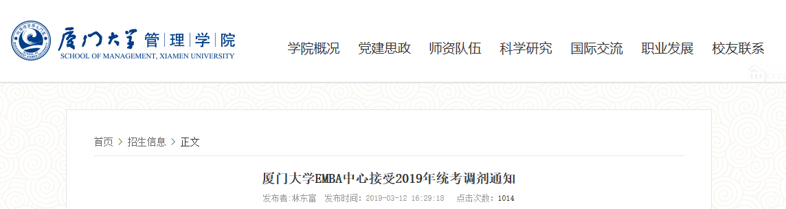 2020考研初試結束之后,考生們在準備EMBA復試的同時,也在準備EMBA調劑。為了幫助大家做好EMBA調劑準備,小編給大家整理了“EMBA接受調劑的院校 | 廈門大學2019年接收EMBA調劑的通知”,希望對需要調劑的同學有所幫助,以下為調劑通知: