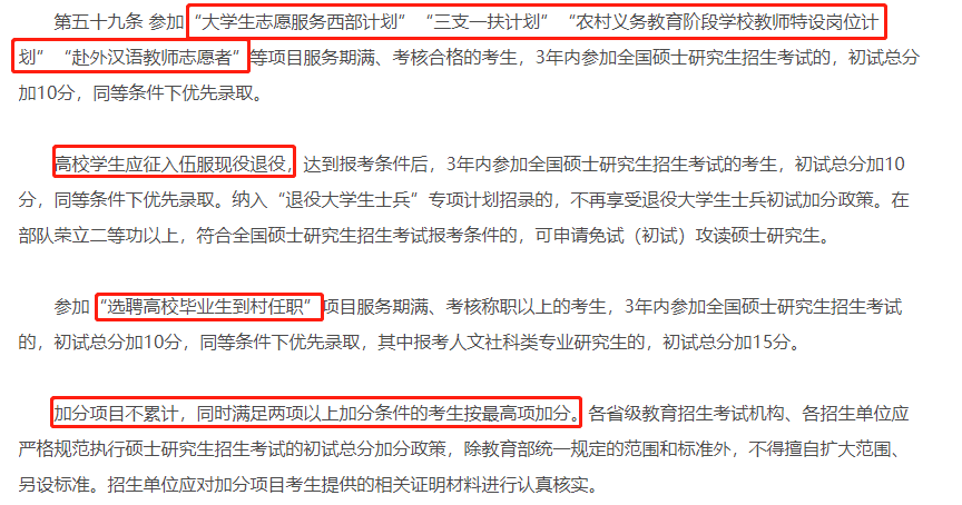 第五十九條 參加“大學(xué)生志愿服務(wù)西部計劃”“三支一扶計劃”“農(nóng)村義務(wù)教育階段學(xué)校教師特設(shè)崗位計劃”“赴外漢語教師志愿者”等項目服務(wù)期滿、考核合格的考生,3年內(nèi)參加全國碩士研究生招生考試的,初試總分加10分,同等條件下優(yōu)先錄取。