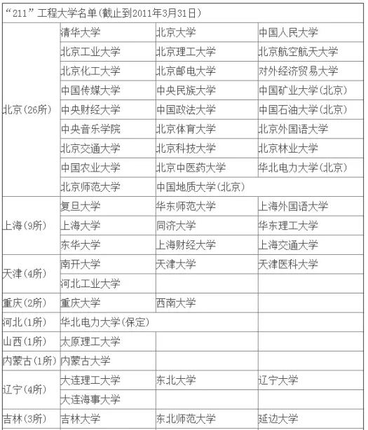 “211工程”重點建設院校多為中央部屬院校,兼顧到各省至少一所省屬院校(部分邊遠省份暫缺),同時兼顧到各行業至少一所。截止到2011年3月,全國共有112所“211工程院校”,其中華北電力大學、中國石油大學、中國地質大學、中國礦業大學擁有兩個校區,實際高校為116所。