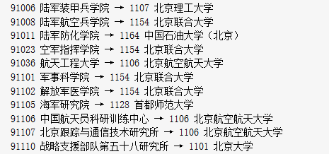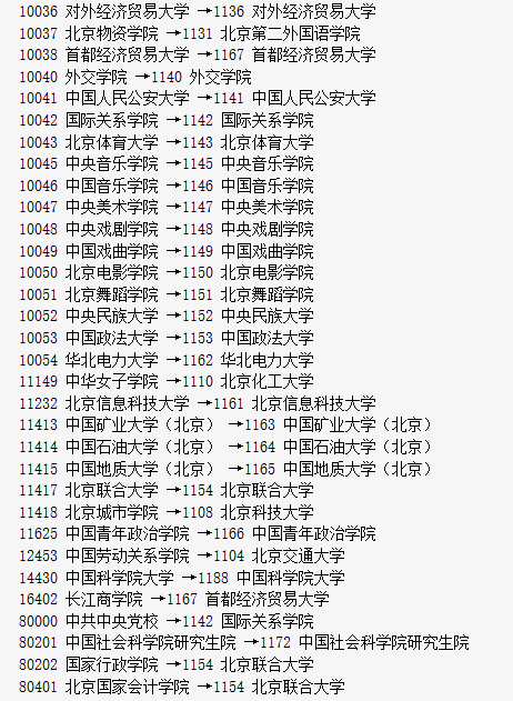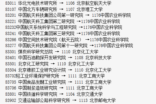 1105北京工業(yè)大學(xué)、1107北京理工大學(xué)、1108北京科技大學(xué)、1110北京化工大學(xué)、1133中國傳媒大學(xué)、1153中國政法大學(xué)、1154 北京聯(lián)合大學(xué)、1166 中國青年政治學(xué)院。