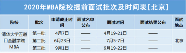 目前已經公布2020MBA提前面試批次及時間的北京名校為:清華大學五道口金融學院MBA和中國人民大學EMBA項目、北京大學匯豐商學院EMBA項目: