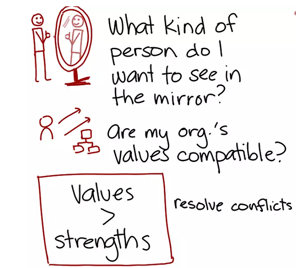 一個人的工作方式和他的長處很少發生沖突,相反,兩者能產生互補。但是,一個人的價值觀有時會與他的長處發生沖突。一個人做得好甚至可以說是相當好、相當成功的事情——可能與其價值體系不吻合。