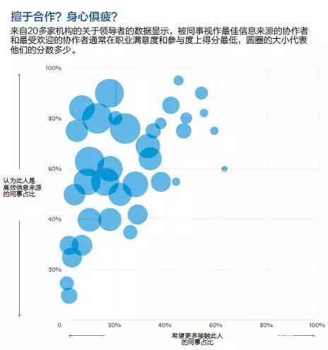 圖表數(shù)據(jù)來自20家樣本機構中業(yè)務部門的直線管理者。表格中上部和右側的人是公司中的最佳信息來源,也是收到協(xié)作請求最多的人。他們的參與度和職業(yè)滿意度得分最低,得分由圓圈大小表示。
