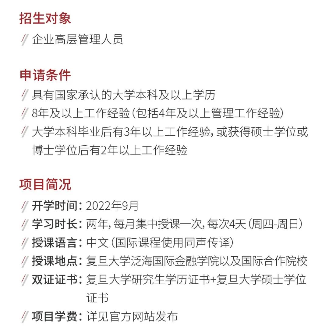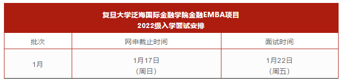 導(dǎo)讀:復(fù)旦大學(xué)泛海國際金融學(xué)院2022級金融EMBA項目(FEMBA)1月面試網(wǎng)上申請,將于2021年1月17日(周日)截止。