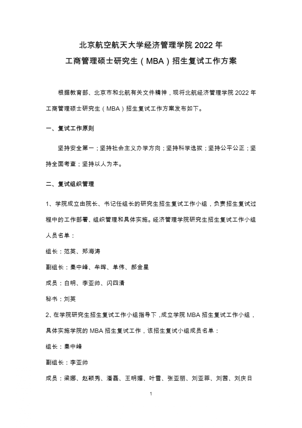 【附件1:2022 年北京航空航天大學經濟管理學院工商管理碩士研究生(MBA)復試名單.pdf】