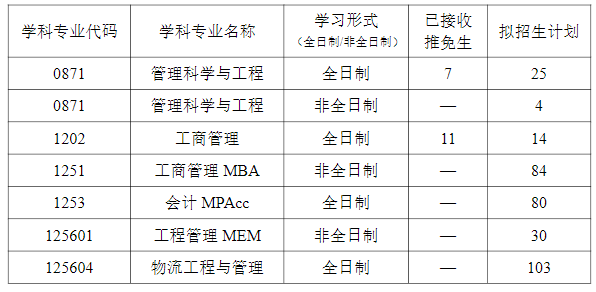 1.專業知識(40分)各專業具體考核內容及知識范圍如下:各專業具體考核內容涉及到考核知識范圍內的應知應會專業基礎理論知識,包括基本概念、基本原理、基本方法、主要內容、影響因素、特學科專業代碼學科專業名稱學習形式(全日制/非全日制)已接收推免生擬招生計劃0871管理科學與工程全日制7250871管理科學與工程非全日制—41202工商管理全日制11141251工商管理MBA非全日制—841253會計MPAcc全日制—80125601工程管理MEM非全日制—30125604物流工程與管理全日制—103點、分類、學派代表人物及其貢獻等。管理科學與工程學術學位考生考核統計學基本理論方法;工商管理學術學位考生考核企業管理基本理論知識;會計專業學位考生考核知識范圍包括會計學和財務管理學基本理論知識;工商管理、工程管理領域專業學位考生考核管理學基本理論知識;物流工程與管理領域專業學位考生考核統計學基本理論方法;單考計劃考生考核企業管理基本理論知識。