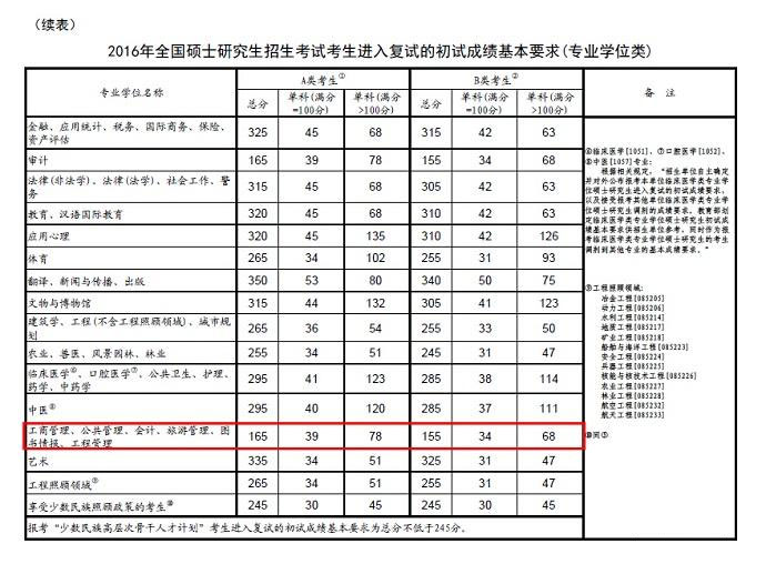 教育部在今日公布《2016年全國碩士研究生招生考試考生進入復試的初試成績基本要求》。工商管理碩士A類院校總分為165分 B類院校總分為155分,詳情請見下表。