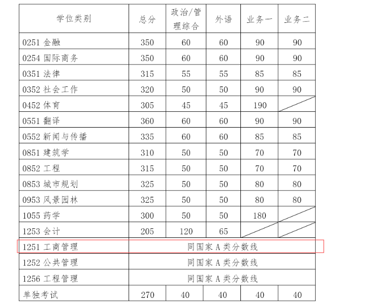 | 學位類別 | 總分 | 政治 | 外語 | 業務一 | 業務二 |