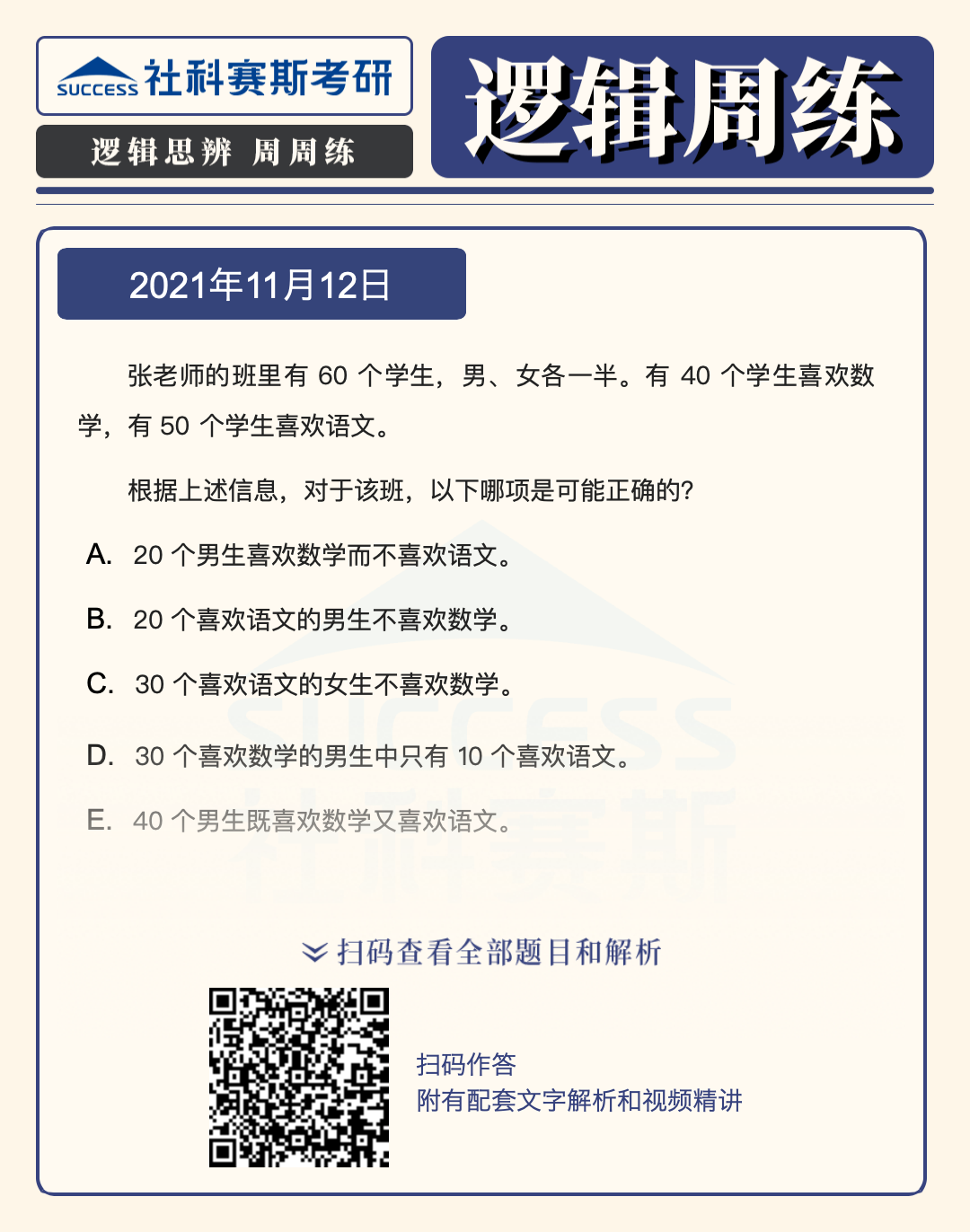 以上就是“2022MBA邏輯:2022MBA聯考邏輯習題及答案解析(11月12日)”的全部內容,更多邏輯精選習題,請持續關注社科賽斯MBA備考網!