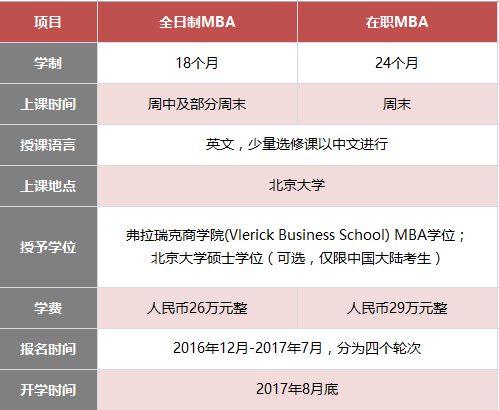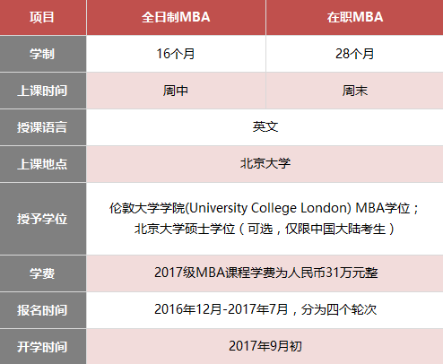 BiMBA商學院的MBA項目創立于1998年,是北京首家中外合作MBA,國際特質鮮明,同時深得北大人文底蘊,獨具國家智庫高度,致力于為學生提供最國際化也最懂中國的管理教育。 ♦ 中國最國際化的MBA項目之一 ♦ 宏觀與微觀、經濟與管理緊密結合 ♦ MBA+金融碩士/地產碩士培養復合型人才 BiMBA商學院MBA項目包括: 北大(PKU)—倫敦大學學院(UCL)MBA項目; 北大(PKU)—弗拉瑞克商學院(Vlerick)MBA項目; 北大-弗拉瑞克商學院“體育產業與大健康”在職MBA項目。 三個項目開學時間為:2017年8月底或9月初,上課地點是北京大學,申請流程為: 面試和筆試通常是在同一天,不分先后順序;2017年申請批次僅剩補充批次,申請材料截止時間為7月10日,校園考試和面試時間為7月21日,錯過這次,只能明年才能申請入學。北大-弗拉瑞克商學院“體育產業與大健康”在職MBA項目申請流程和批次稍有不同,之后會詳細說明。 北大(PKU)—倫敦大學學院(UCL)MBA項目 該MBA項目以全英文授課,設全日制班和在職班。 北大(PKU)—弗拉瑞克商學院(Vlerick)MBA項目 此項目開設全日制MBA、在職MBA以及體育產業與大健康方向在職MBA班型,合計招生100人。 北大-弗拉瑞克商學院“體育產業與大健康”在職MBA項目 北大國發院是全國開設第一家MBA體育產業與大健康專項班,將分別組建體育產業與大健康模塊課程。該項目不是在線申請,而是將材料郵寄至國發院或發送至郵箱;根據報名情況每月安排兩次校園考試,2017年8月底開班。 北大國發院BiMBA商學院MBA項目作為國內商學教育里的翹楚,報考人群非常優秀,留學屬性含金量更高。在僅剩的10天里,有意向的同學抓緊時間。社科賽斯教育集團作為北大國發院MBA項目獨家申請輔導機構,如您在申請過程中有任何疑問均可撥打電話咨詢哦~ 詳情致電:400-010-9168