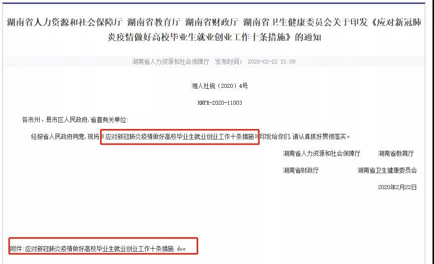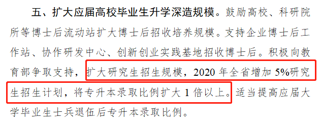 此前,2月22日,湖南省人力資源和社會(huì)保障廳曾發(fā)布《應(yīng)對(duì)新冠肺炎疫情做好高校畢業(yè)生就業(yè)創(chuàng)業(yè)工作十條措施》,第五條“積極向教育部爭取支持,擴(kuò)大研究生招生規(guī)模,2020年全省增加5%研究生招生計(jì)劃,將專升本錄取比例擴(kuò)大1倍以上。”