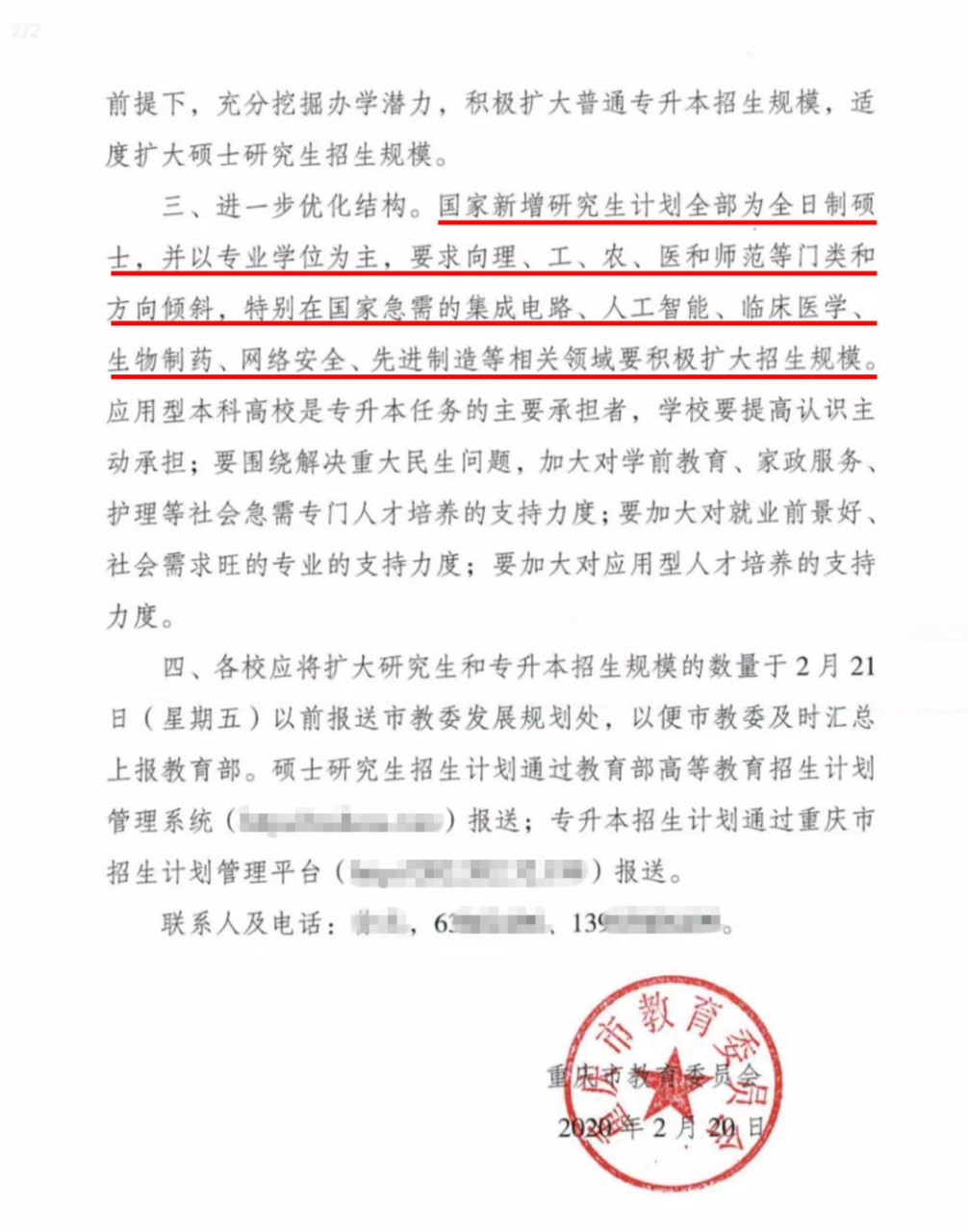 重慶市教育委員會(huì)的文件稱2020年國家擬適度擴(kuò)大碩士研究生招生計(jì)劃總規(guī)模:要求擴(kuò)招的全部是全日制,并以專碩為主,擴(kuò)招專業(yè)主要集中于:理、工、農(nóng)、醫(yī)和師范類,特別是國家急需的集成電路、人工智能、臨床醫(yī)學(xué)、生物制藥、網(wǎng)絡(luò)安全、先進(jìn)制造等領(lǐng)域。