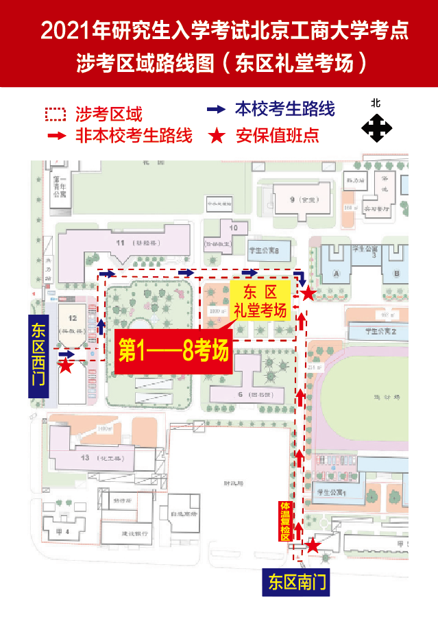 第1至8考場位于阜成路東校區,本校在讀考生憑一卡通由東校區西門進出,非本校在讀考生由東校區南門進出,考場分布及路線圖如下: