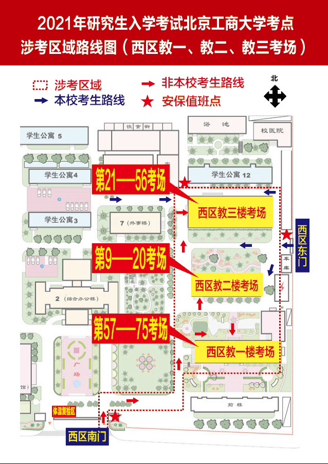 第9至75考場位于阜成路西校區,本校在讀考生憑一卡通由西校區東門進出,非本校在讀考生由西校區南門進出,考場分布及路線圖如下: