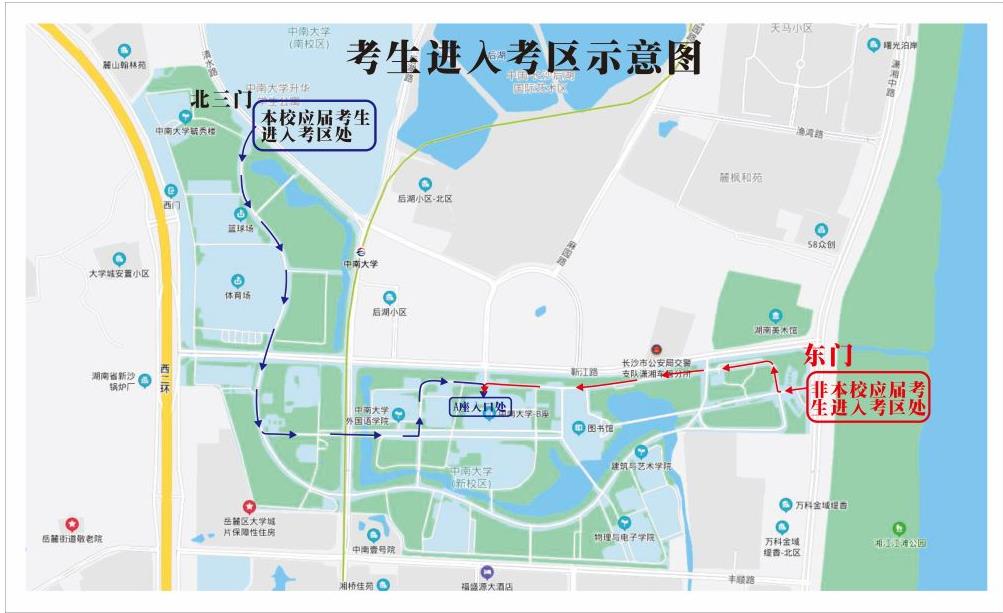 進(jìn)入考區(qū)時間為上午7:50、下午13:20,進(jìn)入考場時間為上午8:00、下午13:30,嚴(yán)禁考生提前進(jìn)入教學(xué)大樓和教室;本校應(yīng)屆畢業(yè)生從新校區(qū)北三門(清水路)進(jìn)入考區(qū),非本校應(yīng)屆畢業(yè)生必須從新校區(qū)東門(瀟湘中路)進(jìn)入考區(qū);遲到15分鐘不得進(jìn)場,即上午8:45、下午14:15后不得進(jìn)場;交卷出場時間不得早于考試結(jié)束前30分鐘,即上午11:00之前、下午16:30之前禁止考生交卷出場。
