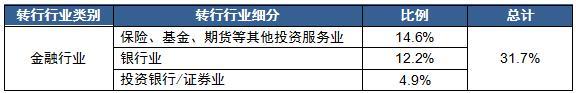 2016年中央財經大學的MBA就業報告里,由非金融行業轉換到金融行業的比率高達31.7%;金融行業之間的轉換比率為17.1%;其中非金融行業轉換到金融行業的具體細分情況如下: