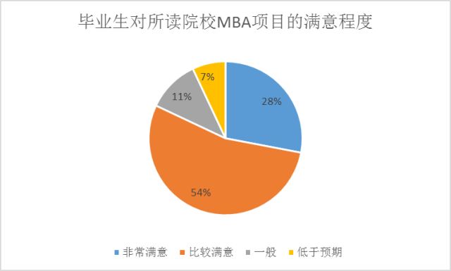 調(diào)查數(shù)據(jù)顯示,54%的被調(diào)查者對(duì)MBA教育比較滿(mǎn)意,28%的被調(diào)查者非常滿(mǎn)意,僅有7%的被調(diào)查者認(rèn)為攻讀MBA低于其預(yù)期。