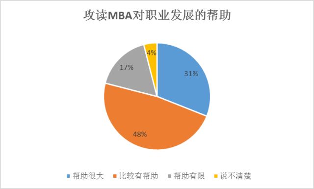 調(diào)查顯示,31%的MBA學(xué)員認(rèn)為攻讀MBA對(duì)其職業(yè)發(fā)展幫助很大,48%的學(xué)員認(rèn)為攻讀MBA對(duì)其職業(yè)發(fā)展比較有幫助,僅有17%的學(xué)員認(rèn)為對(duì)其幫助有限。