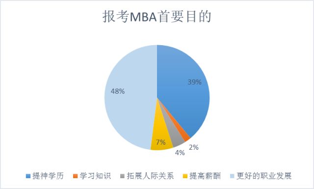 調(diào)查中,有48%的MBA報(bào)考者為了獲得更好的職業(yè)發(fā)展而選擇攻讀MBA,另有39%的報(bào)考者為了提升學(xué)歷而選擇攻讀MBA,也有少數(shù)報(bào)考者為了改善薪資待遇、拓展人際關(guān)系或?qū)W習(xí)知識(shí)而選擇報(bào)考MBA。