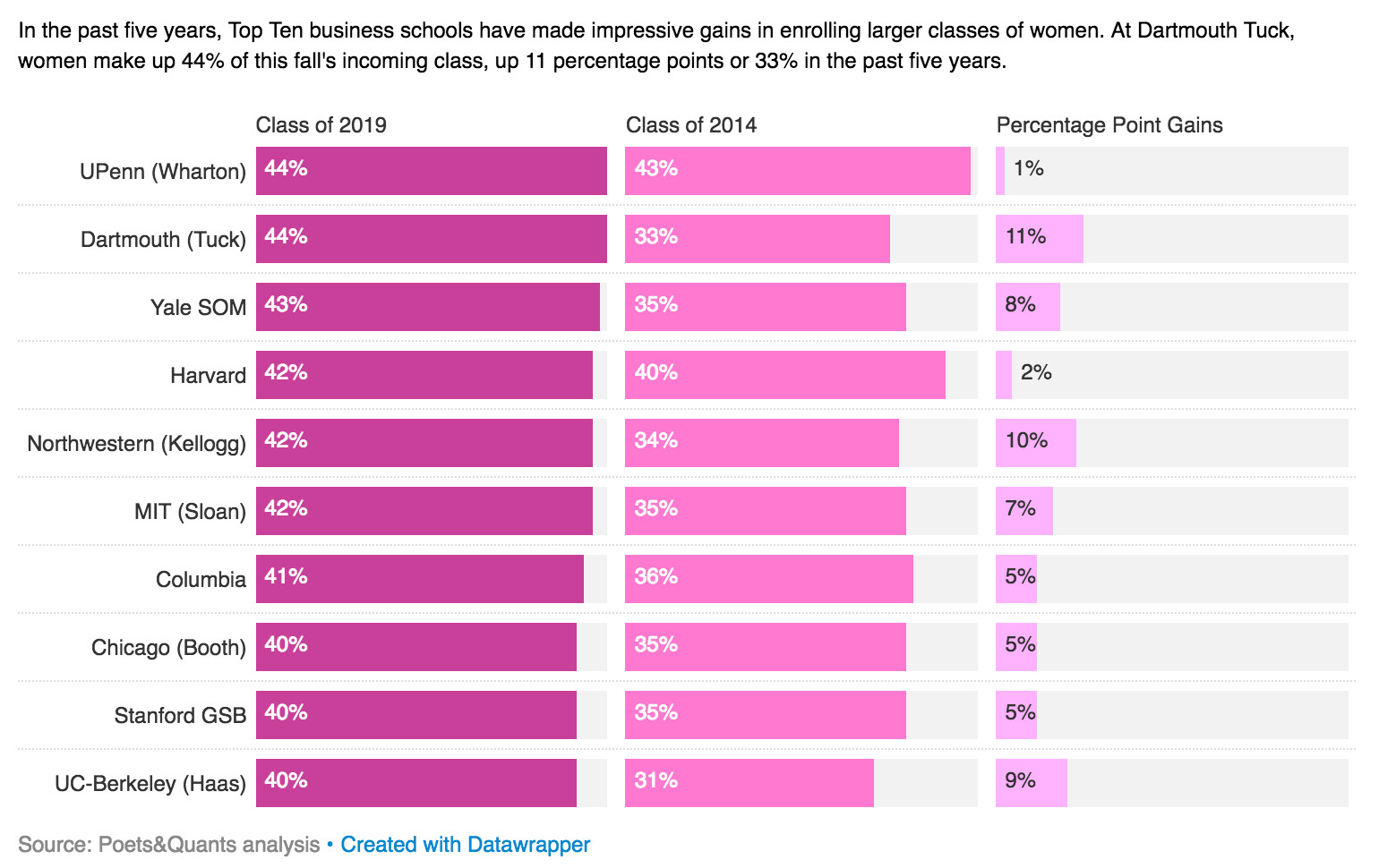 Forté基金會的數(shù)據(jù)也顯示,很多商學(xué)院在鼓勵女性參加MBA課程方面已經(jīng)取得了很大的進(jìn)展。例如,在過去的五年里,每一個排名前十的MBA專業(yè)都在夸耀他們課堂上的女性比以往任何時(shí)候都多。在達(dá)特茅斯大學(xué)塔克商學(xué)院,女性在2017年的入學(xué)學(xué)生中占44%,比2014年的33%上升了11個百分點(diǎn)。西北大學(xué)的凱洛格商學(xué)院在一位女性院長的領(lǐng)導(dǎo)下,在同一時(shí)間段內(nèi)將女性入學(xué)人數(shù)增加了10個百分點(diǎn),從34%增加到42%(見下表)。