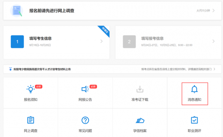 消息通知主要是報考點或招生單位發送的招考網報信息,考生登錄網報平臺,查看消息通知即可!如果沒有收到消息,說明報考點或招生單位沒有新的網報消息通知,考生不必驚慌。★ 確保微信綁定成功個人學信網賬號,及時接收學歷(學籍)校驗結果、交費結果、確認結果通知及各相關單位(省市招辦、招生單位或報考點)發送的消息提醒等。