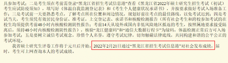 黑龍江省碩士研究生評卷工作將于元旦后開始,2022年2月21日通過“黑龍江省招生考試信息港”對社會發(fā)布成績,屆時,考生可上網(wǎng)查詢本人的考試成績。