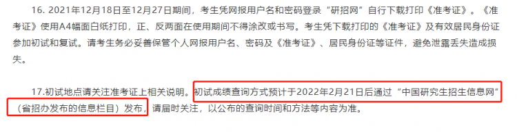 初試成績查詢方式預(yù)計于2022年2月21日后通過“中國研究生招生信息網(wǎng)”(省招辦發(fā)布的信息欄目)發(fā)布,請屆時關(guān)注,以公布的查詢時間和方法等內(nèi)容為準(zhǔn)。
