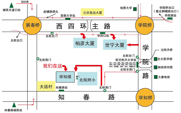 « 乘車路線:331路375路386路392路398路438路478路484路490路498路632路691路693路743路810路836快836路944路運通103線 到北京航空航天大學下車,從東門進,然后注意路標為您指路!