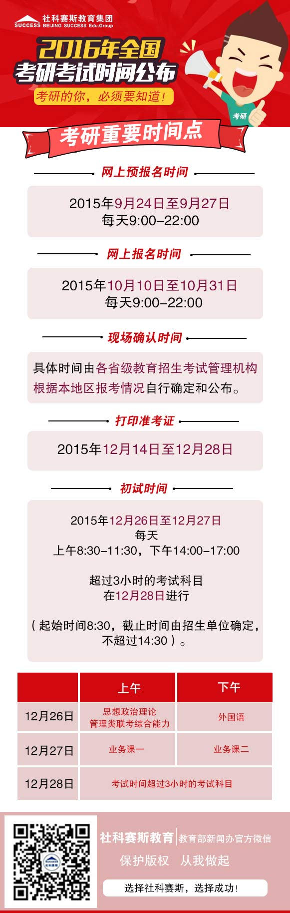 導讀:近日,教育部印發《2016年全國碩士研究生招生考試公告》,公布2016年全國碩士研究生招生考試初試時間。
