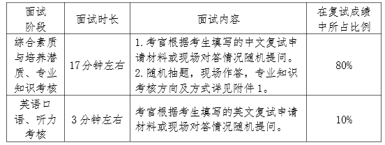 面試成績(jī):滿分100分。面試形式:個(gè)人面試,由考官組面試一位考生。面試分兩個(gè)階段,分別為:綜合素質(zhì)與培養(yǎng)潛質(zhì)、專業(yè)知識(shí)考核;英語口語、聽力考核。
