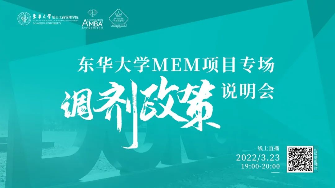 即日起,東華大學旭日工商管理學院2022年入學非全日制MEM接受考生調劑意向登記。凡參加2022年全國管理類聯考,且滿足非全日制MEM報考條件的考生均可申請。