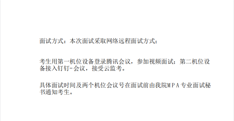 具體面試時間及兩個機位會議號在面試前由我院MPA專業面試秘書通知考生。