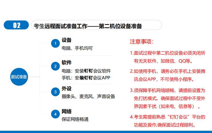 (二)面試方式:采取網絡遠程面試方式。考生用第一機位設備登錄騰訊會議,參加視頻面試;第二機位設備接入釘釘-會議,接受云監考。