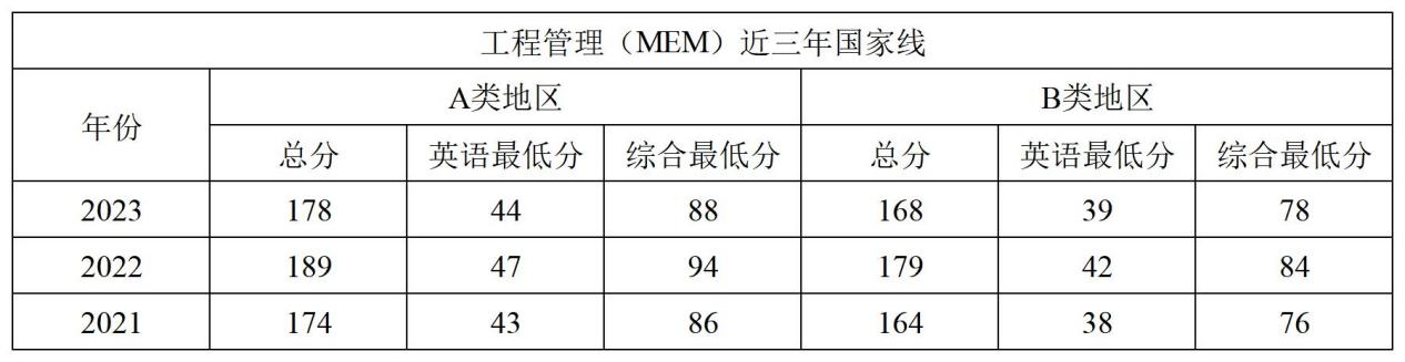 2.復試時間、地點、方式由我校確定,將另行通知。浙江財經大學MEM教育中心組織命題和考試。工程管理(MEM)近三年國家線分數如下: