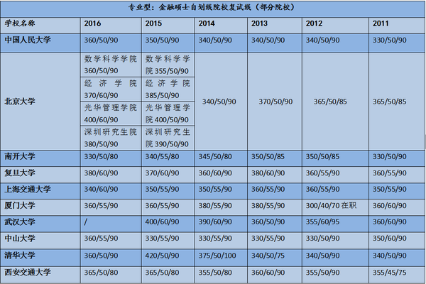 分數線很大程度上反應了備考難度,是擇校時必須考慮的因素。開設金融學專業的院校中,一部分是自劃線,一部分是國家線。下面是2011年到2016年金融學專業的復試分數線,希望能幫助大家了解各高校的備考難度。
