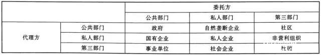 20世紀90年代,針對“極左”和“極右”思潮的影響,安東尼·吉登斯提出了“第三條道路”的政治綱領。“極左”思潮表現為“反市場,親國家”,而“極右”思潮表現為“親市場,反國家”。“第三條道路”主張在市場與國家之間嵌入市民社會,形成三元新混合經濟,代替市場與政府的二元混合經濟。就公共管理而言,新混合經濟意味著公共、私人和第三部門間的伙伴關系;公共部門對應于國家,私人部門對應于市場,第三部門對應于市民社會。這里,伙伴關系可以理解為委托-代理關系。第三部門既可以是委托方,又可以是代理方;委托方與代理方的分離與重組就形成了組織(法人行動者)的九種理想類型,它們是政府、自然壟斷企業、社區、國有企業、私人企業、非營利組織、事業單位、社會企業和社團(見表1)。通過合并同類項,法人行動者可以簡化為政府、企業、事業單位、社區、非營利組織和社團。就歸屬關系而言,企業是按市場運作的營利組織,代表私人部門;政府和事業單位是國家設立的公共服務組織,代表公共部門;非營利組織、社團和社區是市民社會組織,代表第三部門。