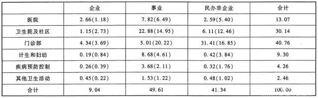 依據2009年我國的法人單位普查數據,我國衛生醫療機構總體為172838個。其中,醫院有22595個,占總體的13.07%;衛生院及社區醫療有52091個,占總體的30.14%;門診部有70454個,占總體的40.76%;計劃生育和婦幼保健有16071個,占總體的9.30%;疾病預防控制和防治有7368個,占總體的4.26%;其他衛生活動有4259個,占總體的2.46%(見表2和表3)。由此可見,作為基層醫療機構,門診部、衛生院和社區醫療占總體的70.9%,為超大百分比。此外,就衛生醫療供給主體而言,企業法人有15630個,占總體的9.04%;事業法人有85751個,占總體的49.61%;民辦非企業法人有71457個,占總體的41.34%(見表2和表3)。由此可見,事業單位和民辦非企業是衛生醫療體制中的主要組分,而不是企業,這一定程度上表明市場不是衛生醫療服務的主要供給主體。