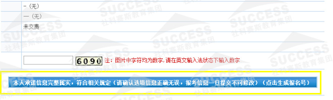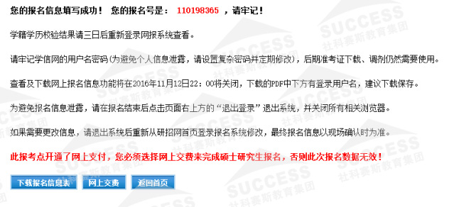 6、 生成報(bào)名號(hào)后本次報(bào)名才為成功(如果選擇的報(bào)考點(diǎn)需要網(wǎng)上交費(fèi),那么交費(fèi)成功后才算報(bào)名成功),請系統(tǒng)查看,牢記報(bào)名號(hào),現(xiàn)場確認(rèn)時(shí)提供給報(bào)考點(diǎn)。