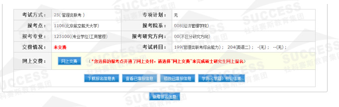 若此報(bào)考點(diǎn)開通了網(wǎng)上支付,您必須選擇網(wǎng)上交費(fèi)來完成碩士研究生報(bào)名,否則此次報(bào)名數(shù)據(jù)無效!(如果您在本次交費(fèi)過程中交易處理失敗,您可以在網(wǎng)上報(bào)名期間隨時(shí)登錄網(wǎng)上報(bào)名系統(tǒng)進(jìn)行網(wǎng)上支付)