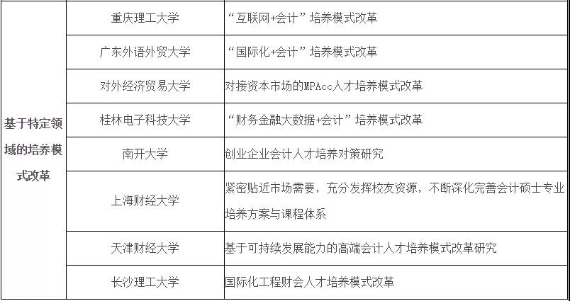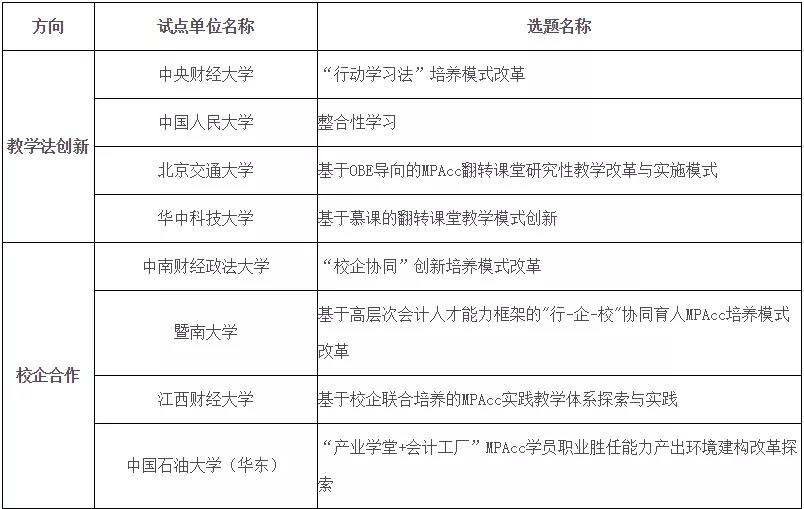 會(huì)計(jì)教指委邀請(qǐng)了16家培養(yǎng)單位參與深化綜合改革試點(diǎn)工作,改革試點(diǎn)方向包括教學(xué)法創(chuàng)新、校企合作以及基于特定領(lǐng)域的培養(yǎng)模式改革: