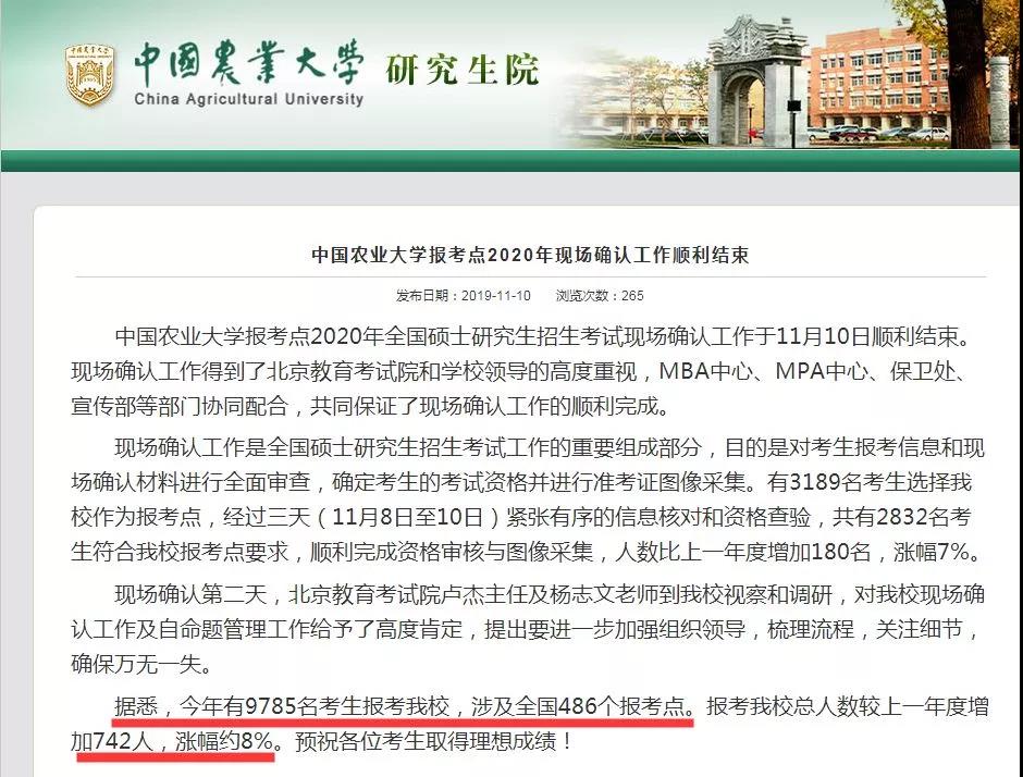 今年有9785名考生報考中國農業大學,較上一年度增加742人,漲幅約8%。2020年擬招收碩士研究生約3000人,其中全日制學術型碩士生約1400人,全日制專業學位碩士生約1200人,非全日制專業學位碩士生約400人。