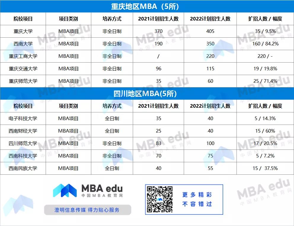 西南地區(qū)共有10所院校在今年有不同程度的擴(kuò)招,其中西南大學(xué)非全日制MBA,去年計(jì)劃招生人數(shù)190人,今年擴(kuò)招至350人,擴(kuò)招160人,增幅84.2%。