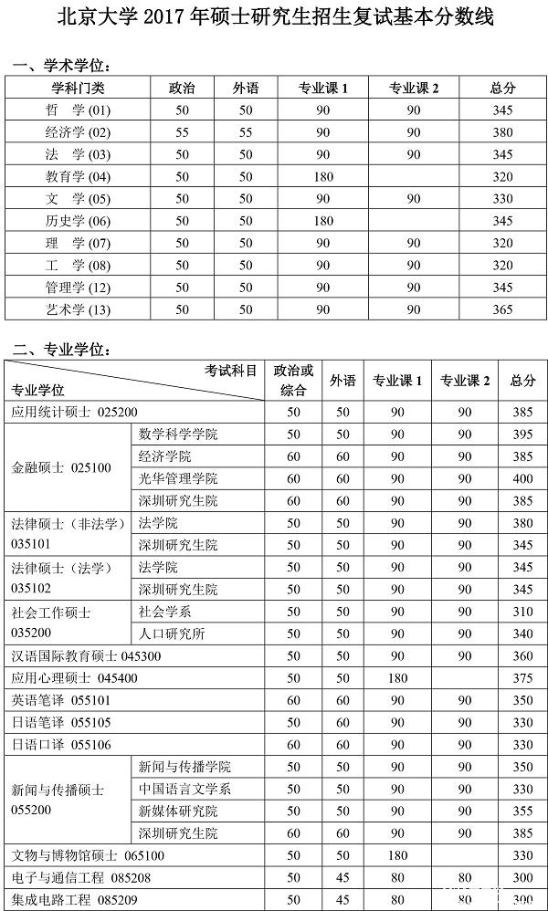 北京大學研究生院今日公布了2017 年碩士研究生招生復試基本分數線 。北大 MPAcc(會計碩士)分數線為總分240/綜合130/外語50,下圖為完整版通知。
