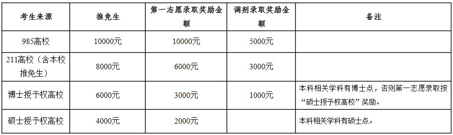 (1)生源獎學金:從2014年起,對達到國家復試分數要求并被我校錄取的非定向碩士研究生給予一次性入學獎勵。獎勵標準如下: