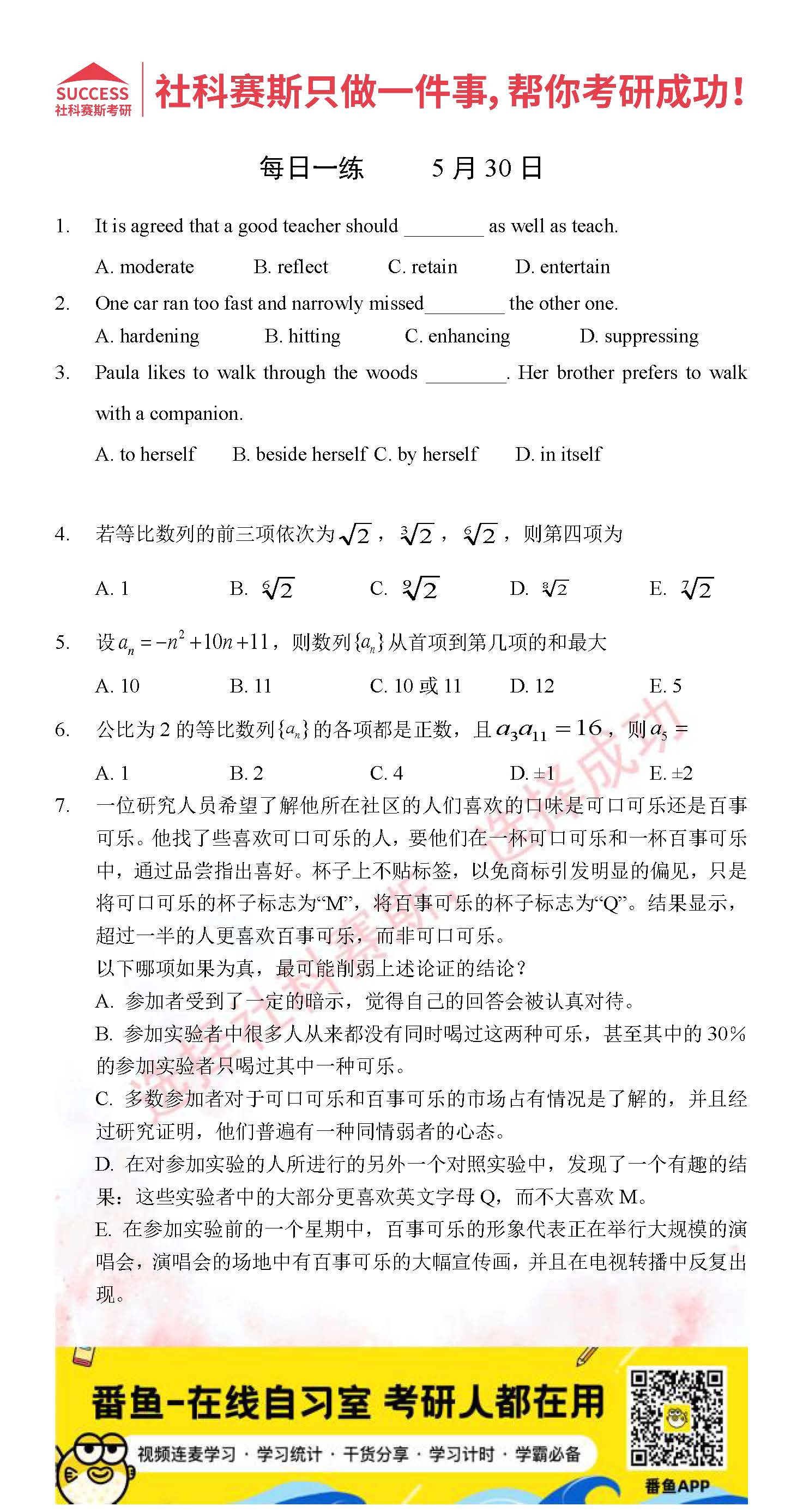 導讀:考研是一場持久戰,保持良好的學習習慣,是能確保復習高效的關鍵。今天社科賽斯MBA備考網小編整理了“2022管理類聯考5月30日每日一練及答案”的內容,希望能對廣大考生有所幫助。