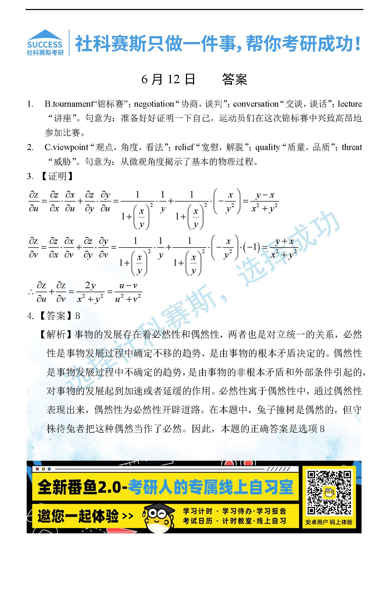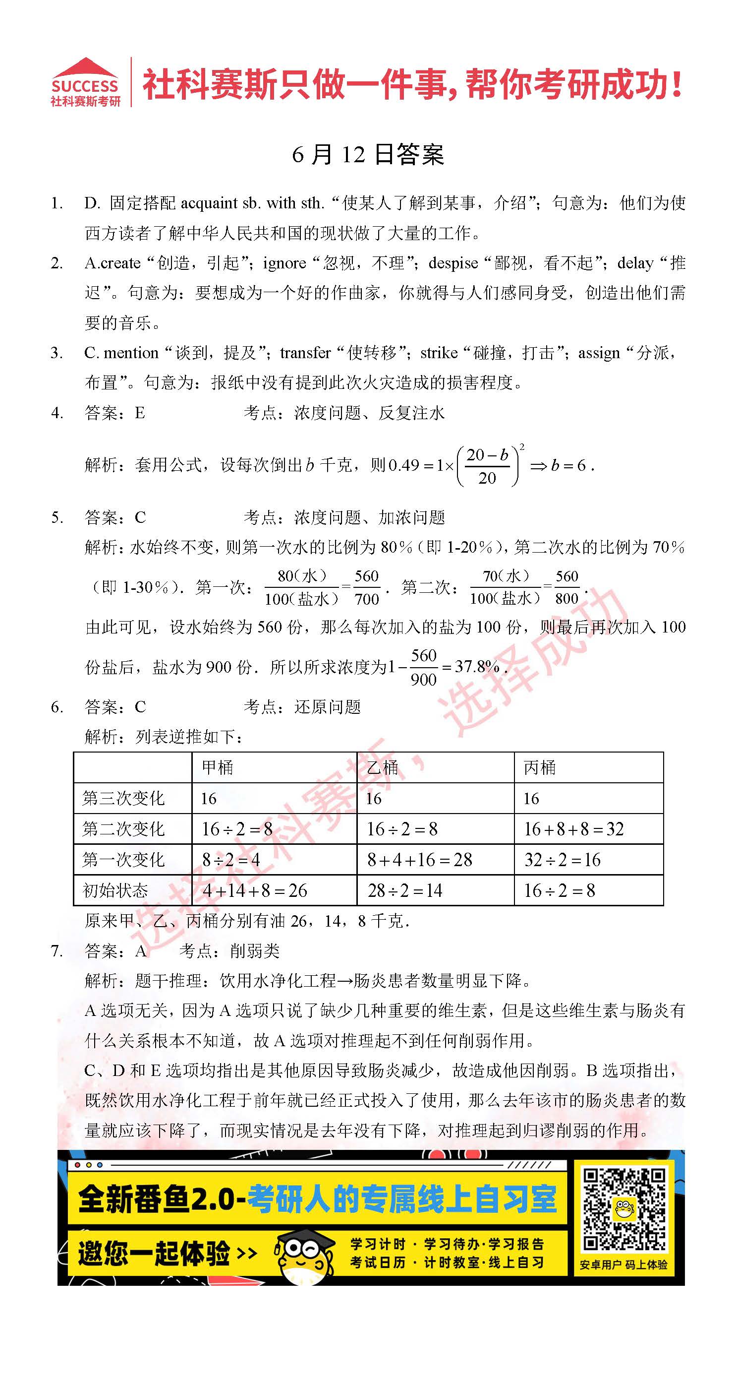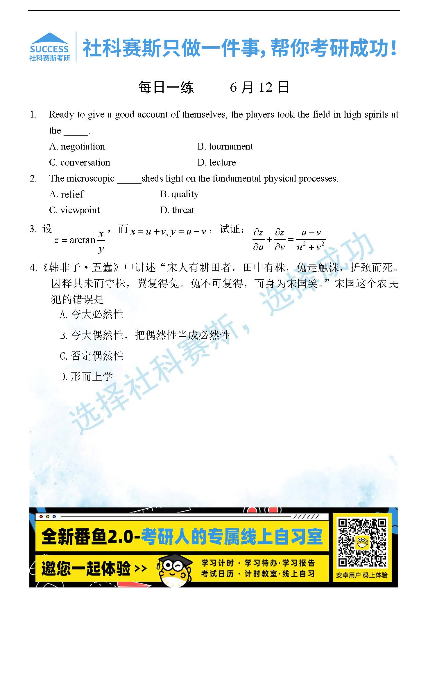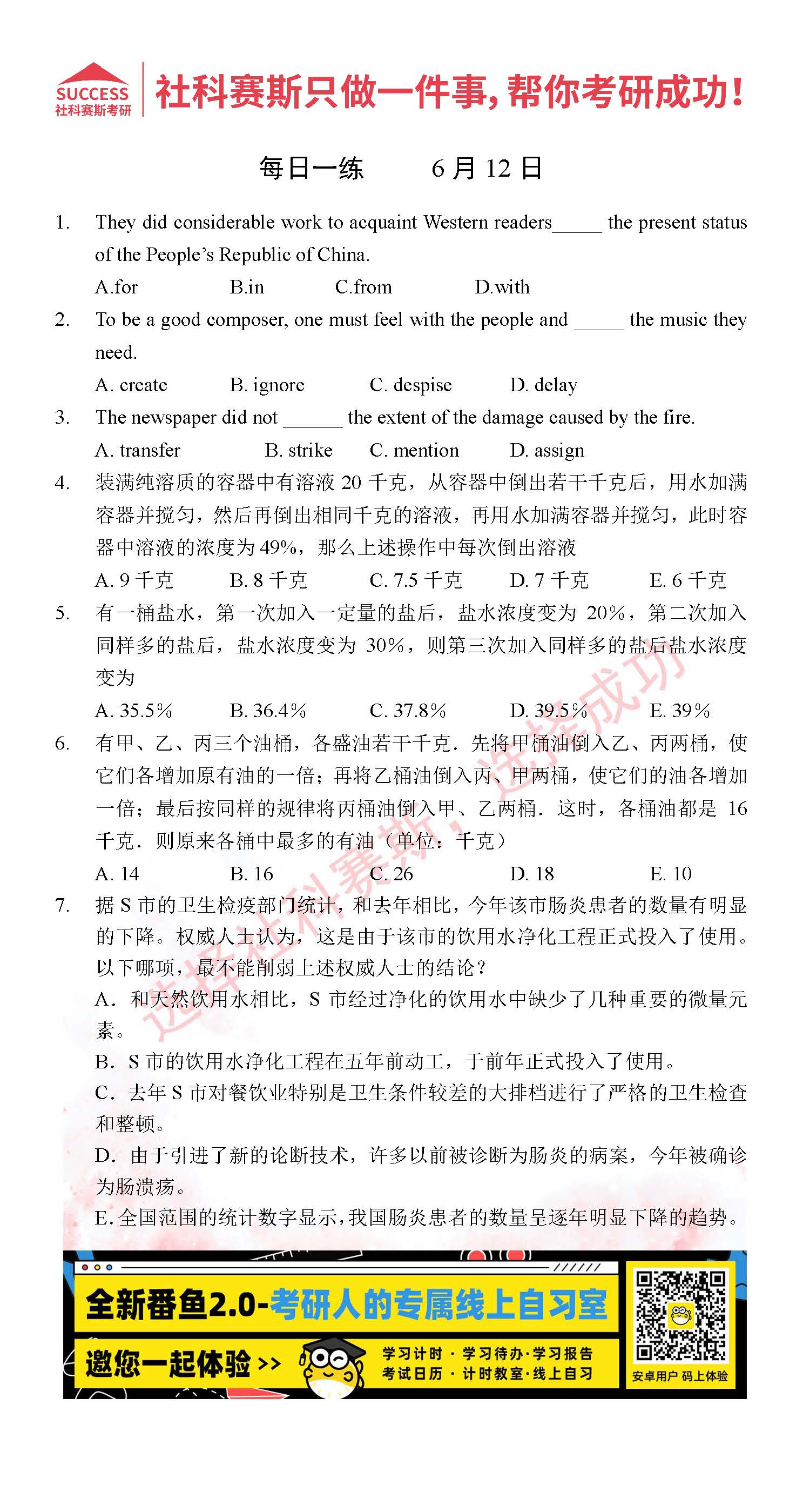 導(dǎo)讀:考研是一場(chǎng)持久戰(zhàn),保持良好的學(xué)習(xí)習(xí)慣,是能確保復(fù)習(xí)高效的關(guān)鍵。今天社科賽斯MBA備考網(wǎng)小編整理了“2022管理類聯(lián)考6月12日每日一練及答案”的內(nèi)容,希望能對(duì)廣大考生有所幫助。