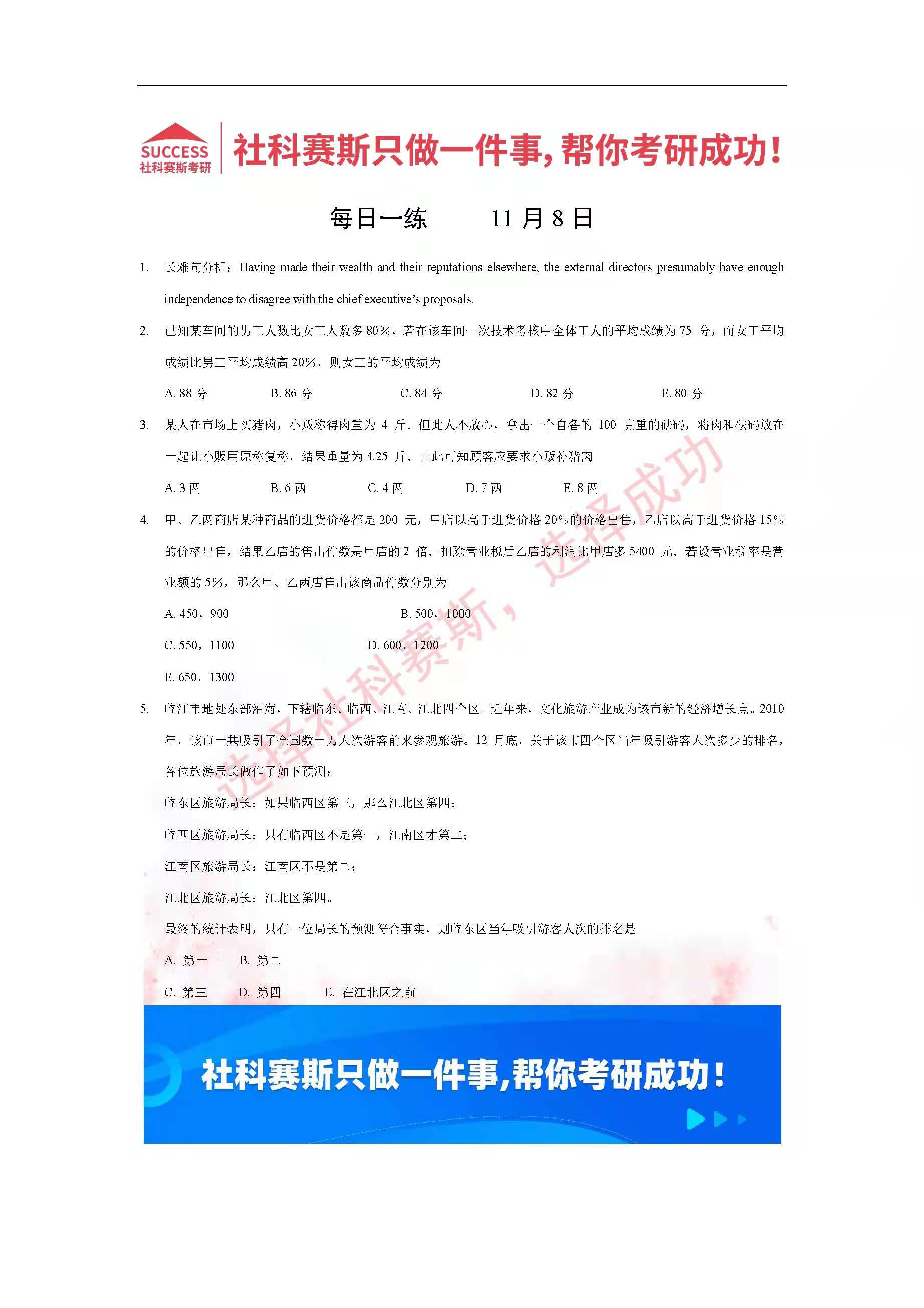 導讀:考研是一場持久戰,保持良好的學習習慣,是能確保復習高效的關鍵。今天社科賽斯MBA備考網小編整理了“2022管理類聯考11月8日每日一練及答案”的內容,希望能對廣大考生有所幫助。