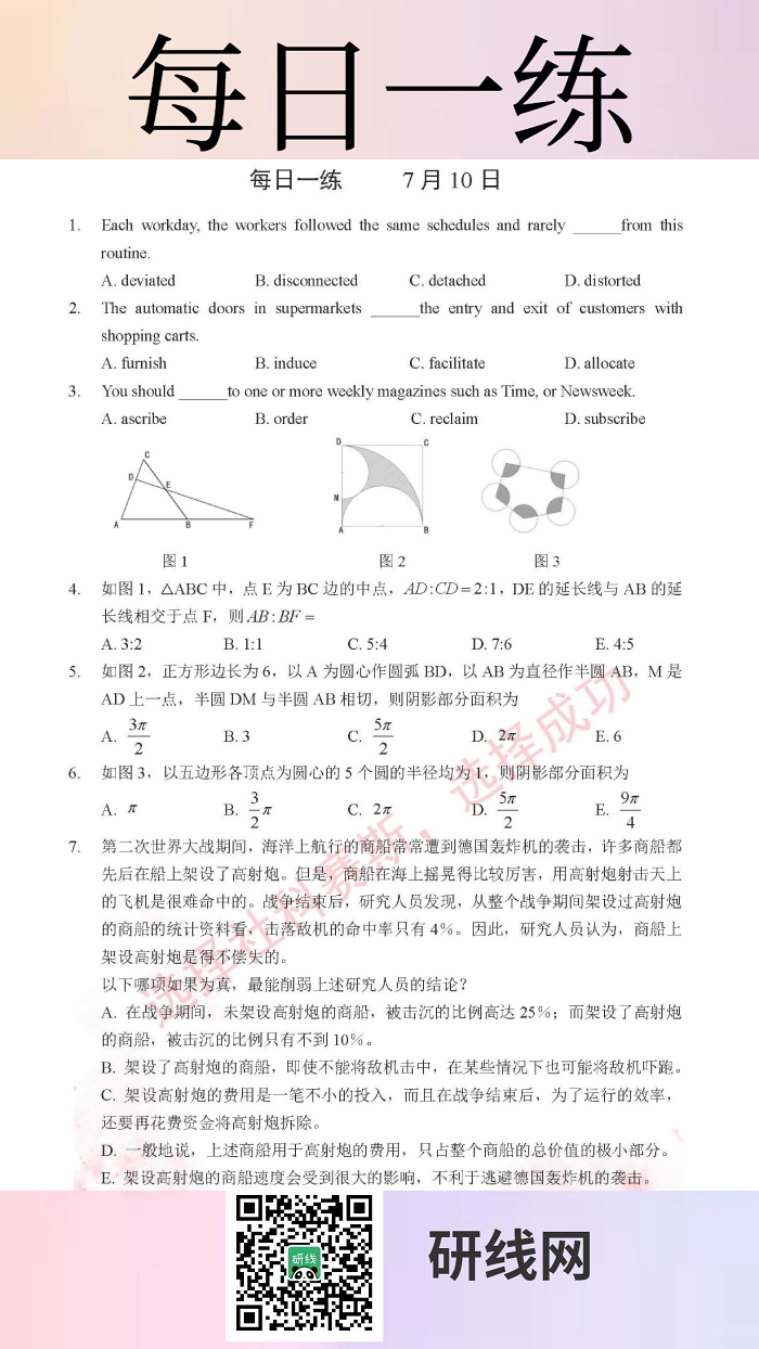 導讀:考研是一場艱苦的奮斗,每一個成功的人都是堅持到最后的。MBA備考網小編為大家整理了一些管綜題,作為大家的每日一練。希望能夠幫助到大家。