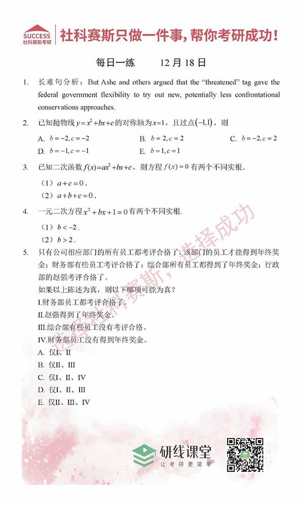 導讀:考研是一場艱苦的奮斗,每一個成功的人都是堅持到最后的。MBA備考網小編為大家整理了一些管綜題,作為大家的每日一練。希望能夠幫助到大家。