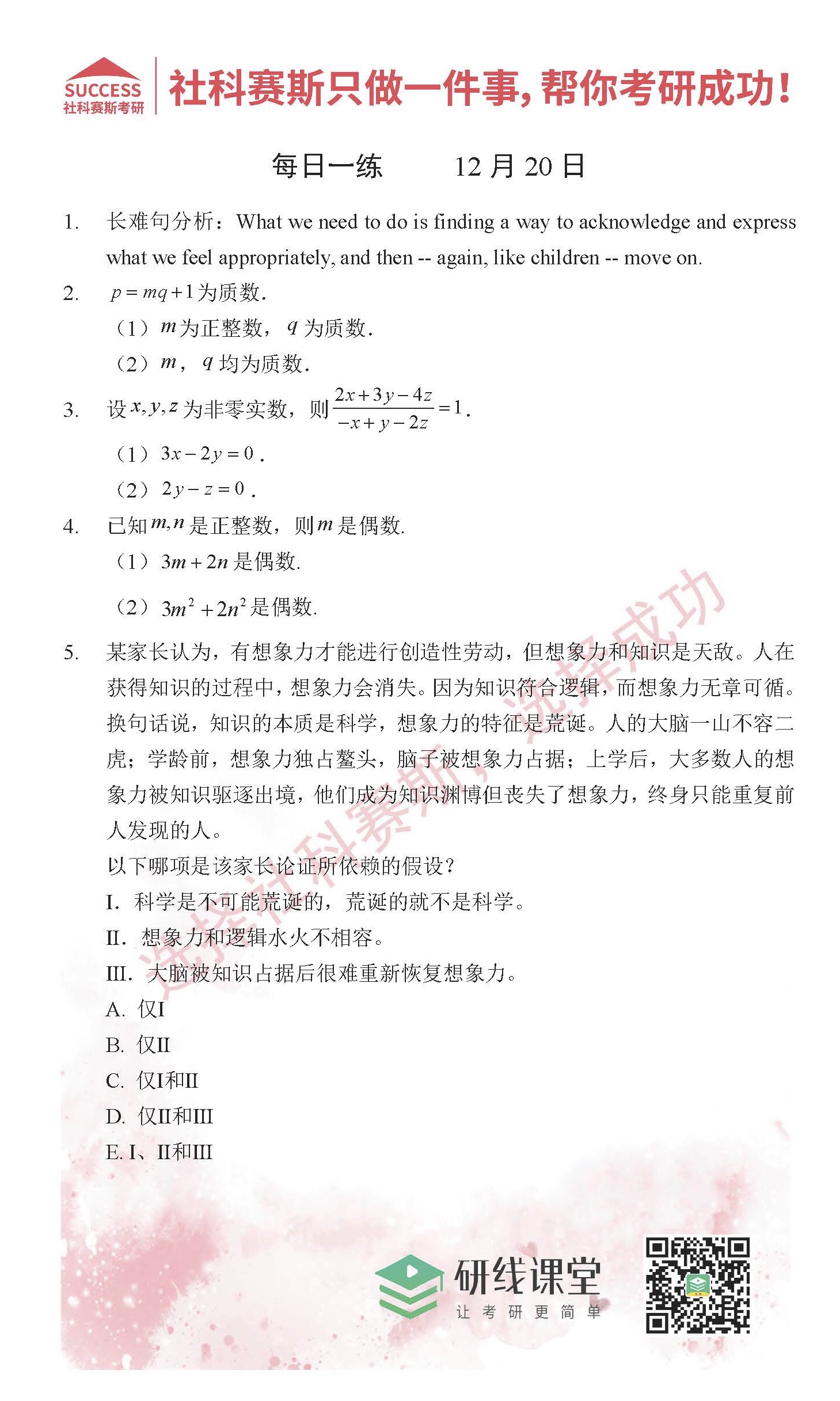 考研是一場(chǎng)艱苦的奮斗,每一個(gè)成功的人都是堅(jiān)持到最后的。MBA備考網(wǎng)小編為大家整理了一些管綜題,作為大家的每日一練。希望能夠幫助到大家。